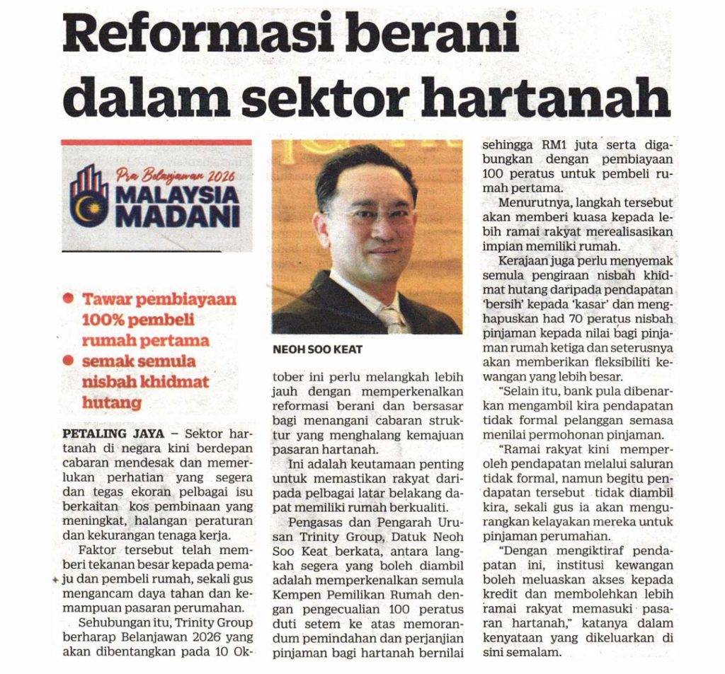 Sehubungan itu, Trinity Group berharap Belanjawan 2026 yang akan dibentangkan pada 10 Oktober ini perlu melangkah lebih jauh dengan memperkenalkan reformasi berani dan bersasar bagi menangani cabaran struktur yang menghalang kemajuan pasaran hartanah.
