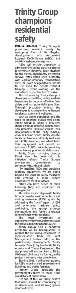 KUALA LUMPUR: Trinity Group is prioritising resident safety by equipping five of its flagship developments with Automated External Defibrillators (AEDs) and mobility-assistance equipment.