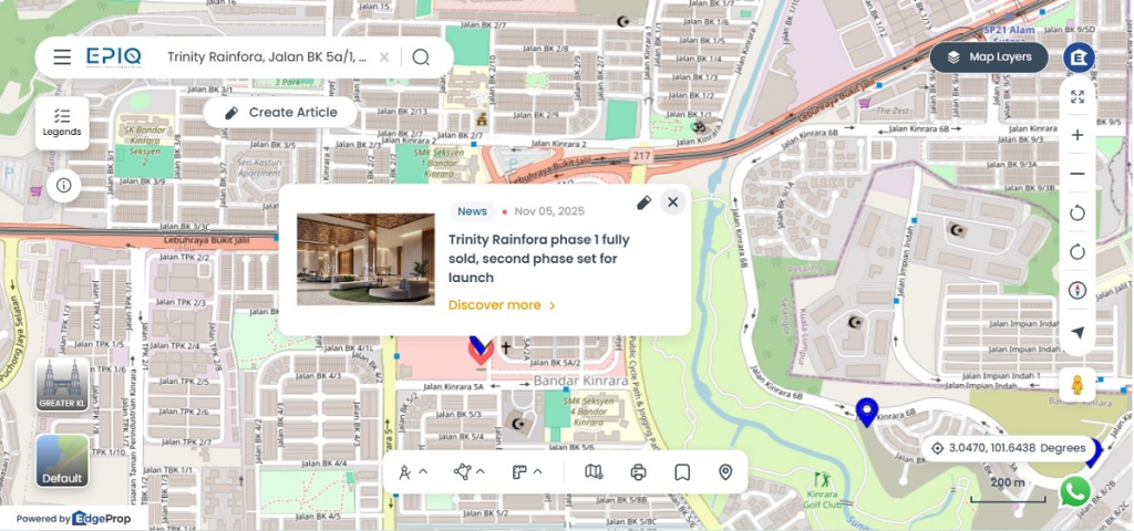 Situated on a 2.4-acre freehold site just 3km from Pavilion Bukit Jalil, Trinity Rainfora is a transit-oriented development (TOD) located only 400m from the BK5 LRT station. This combines urban convenience with a sanctuary-style living experience. With a total gross development value (GDV) of RM395 million, Trinity Rainfora features high-rise serviced apartments with built-ups ranging from 739 to 1,184 sq ft, designed with young professionals, families, and upgraders in mind.